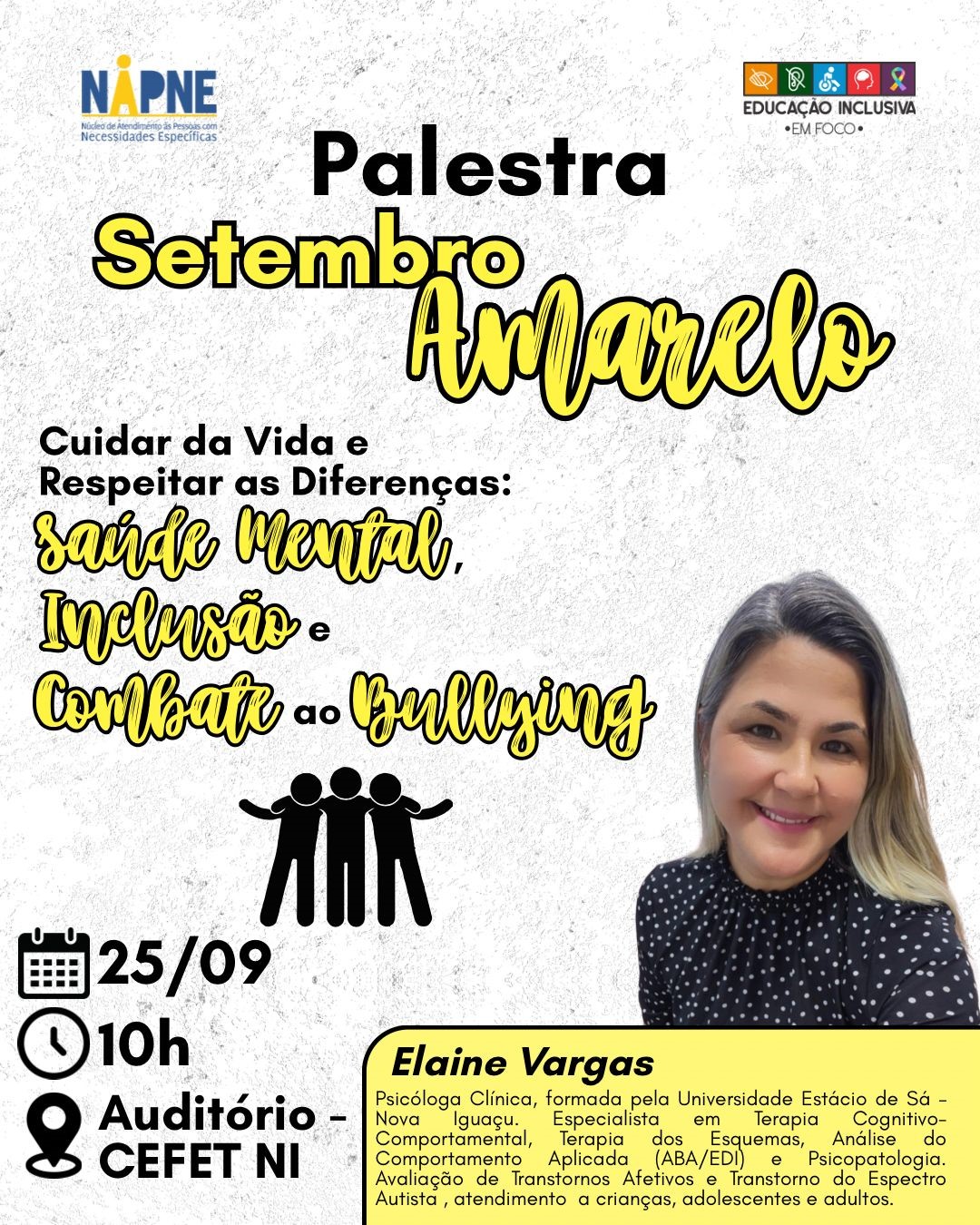 No dia 25/09, às 10h, no Auditório do CEFET NI, teremos uma palestra especial com a psicóloga Elaine Vargas, abordando temas fundamentais como saúde mental, inclusão e combate ao bullying.