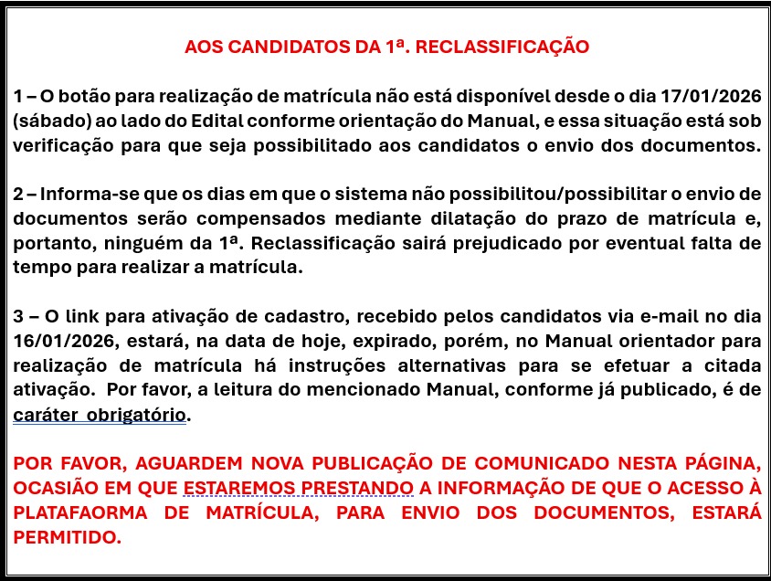 04/01/2026 - O PERÍODO DE MATRÍCULA da 1a. chamada não terá início no dia 05/01/2026 conforme previsto no COMUNICADO nº 04/2025 da Coordenação de Concursos, o qual foi publicado nesta página em 10/12/2025, mas sim em 06/01/2026, a partir das 10h.