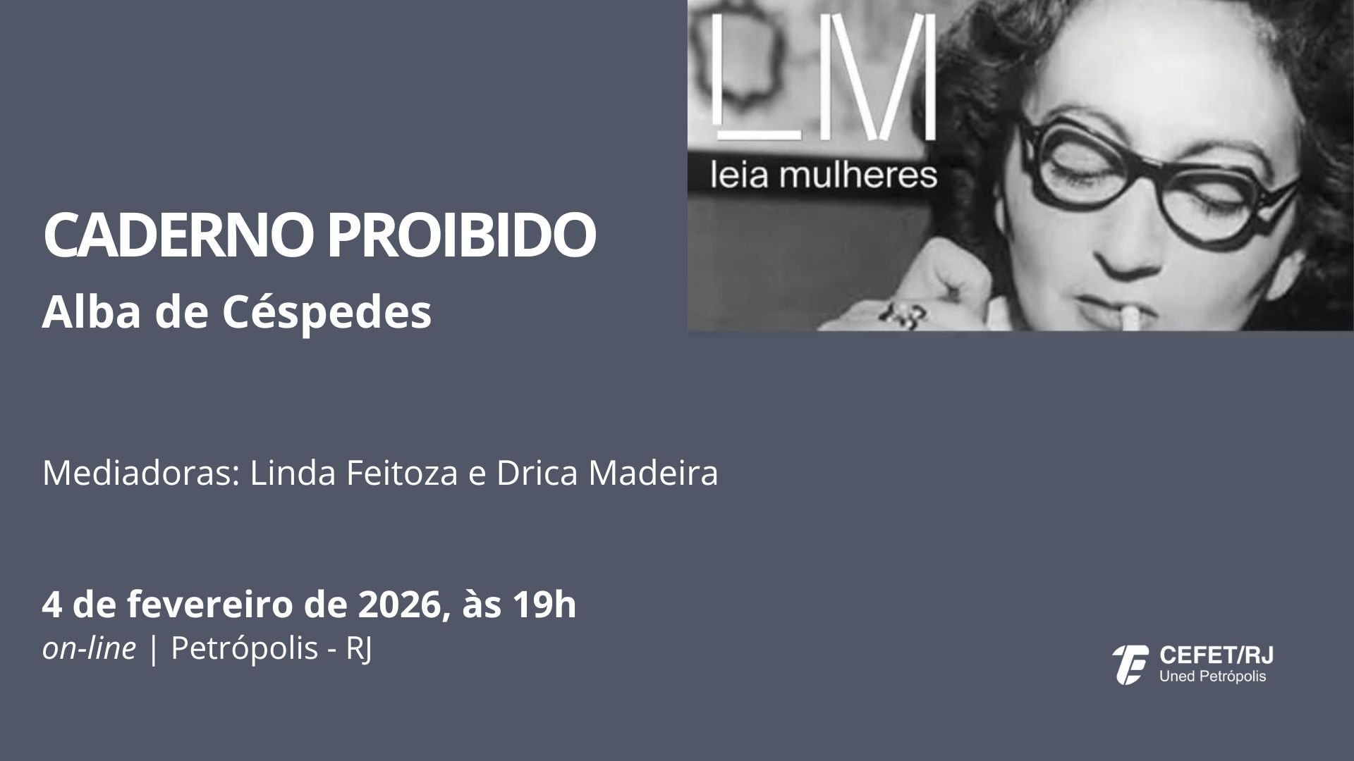 O encontro, que contará com a mediação de Linda Feitoza e Drica Madeira, será on-line no dia 4 de fevereiro, a partir das 19h, pelo Google Meet. Os interessados em participar devem solicitar o link do evento por meio das redes sociais – Leia Mulheres Petrópolis no Instagram e grupo Leia Mulheres Petrópolis-RJ no Facebook.