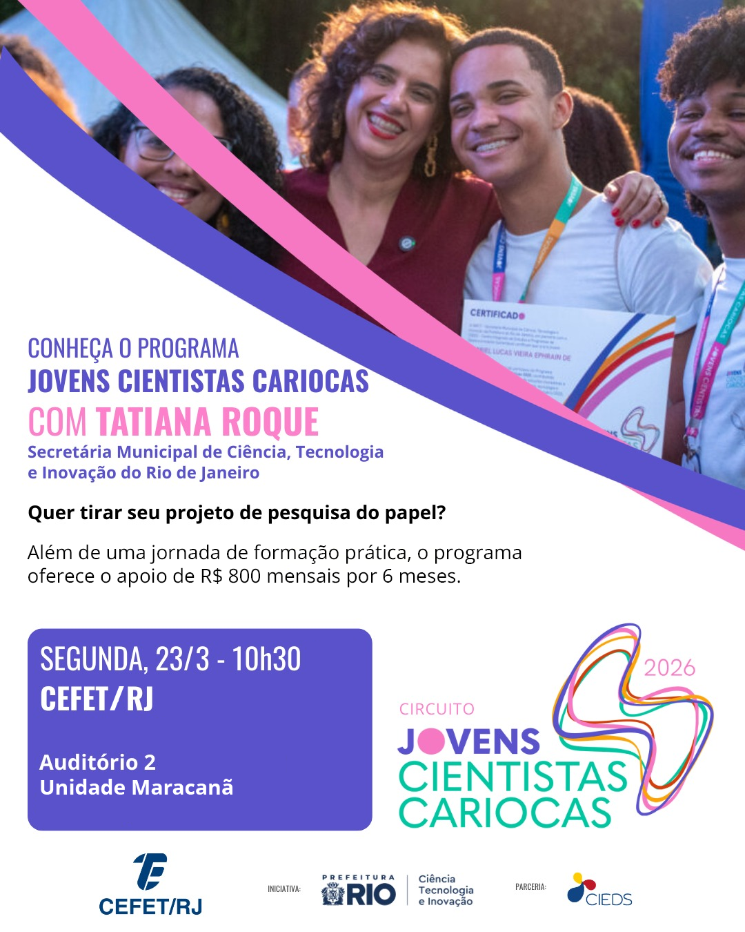 Na próxima segunda-feira (23), o Auditório 2 da Unidade Maracanã receberá a atual secretária municipal de Ciência, Tecnologia e Inovação do Rio de Janeiro, Tatiana Roque, para apresentar o Programa Jovens Cientistas Cariocas. O evento inicia às 10h30 e é aberto a alunos da graduação do Cefet/RJ. Os participantes terão direito a certificado.