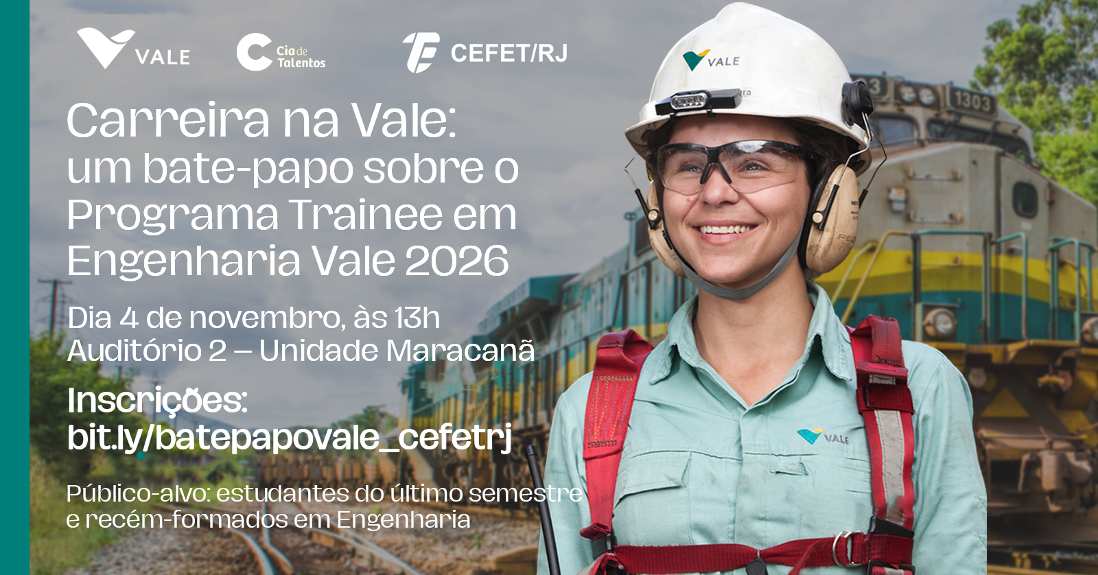 Organizado pela Vale e pela empresa de recrutamento Cia de Talentos, o evento tem o objetivo de promover um bate-papo aberto sobre carreira, desenvolvimento profissional e o Programa Trainee em Engenharia Vale 2026. Serão apresentados os processos internos da empresa no desenvolvimento de talentos e as diferentes etapas do programa, como mentorias, job rotation e trilhas técnicas especializadas.