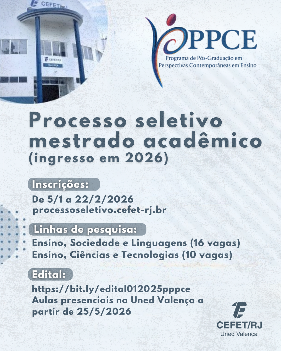 O Programa de Pós-Graduação em Perspectivas Contemporâneas em Ensino (PPPCE), do Cefet/RJ Uned Valença, está com vagas abertas para a primeira turma de mestrado acadêmico. As inscrições acontecem de 5 de janeiro a 22 de fevereiro de 2026 através do site processoseletivo.cefet-rj.br. Serão ofertadas 26 vagas para duas linhas de pesquisa: Ensino, Sociedade e Linguagens (16 vagas) e Ensino, Ciências e Tecnologias (10 vagas). Destas, 12 vagas serão destinadas para candidatos pretos, pardos, indígenas e quilombolas e uma vaga para pessoa com deficiência. As aulas presenciais acontecerão na Uned Valença a partir do dia 25/5/2026.