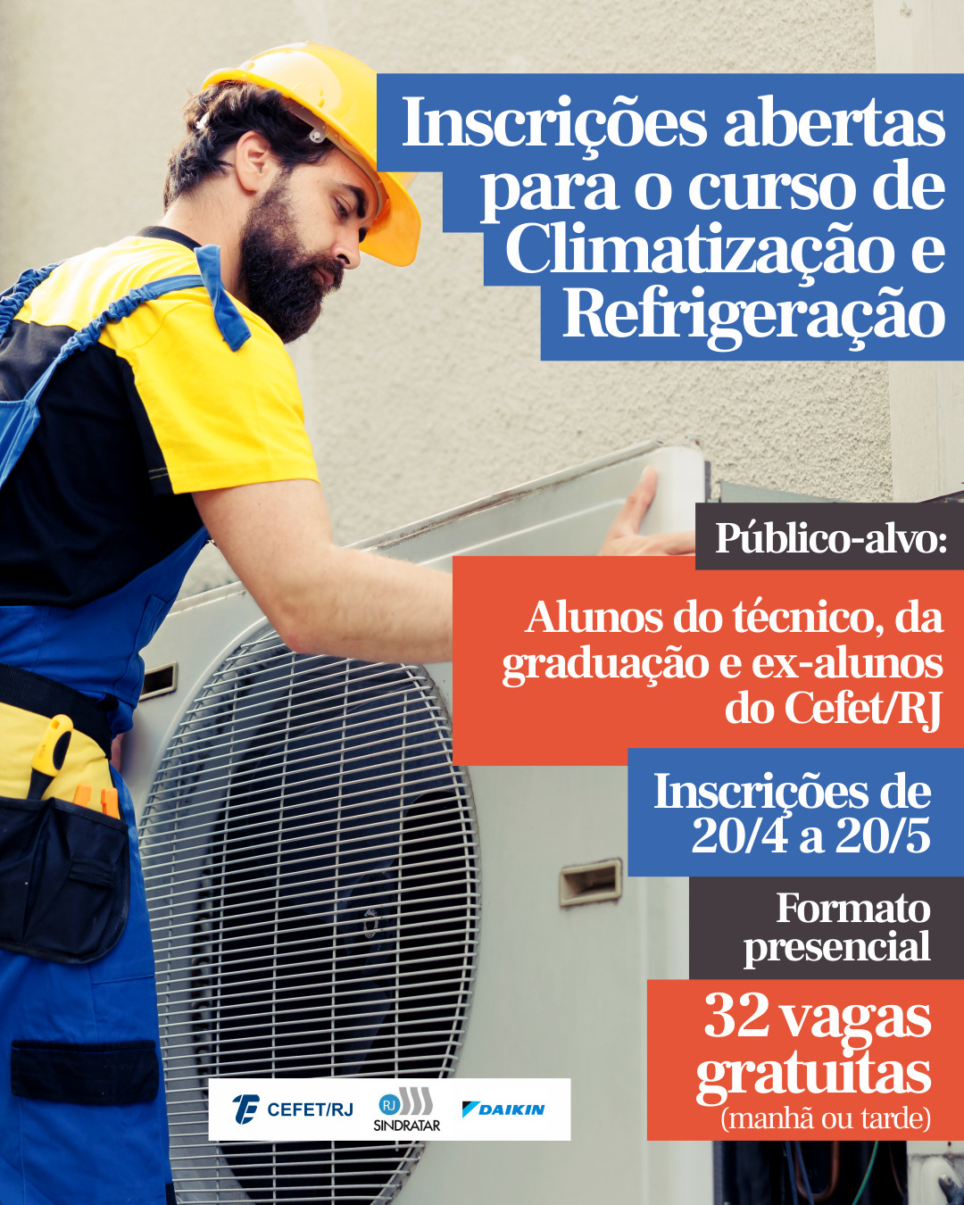 Serão oito encontros, entre os dias 26 de maio e 26 de junho, com aulas presenciais na sede do Sindicato da Indústria de Refrigeração, Aquecimento e Tratamento do Ar do Estado do Rio de Janeiro (Sindratar-RJ), localizada na Rua Campos Sales, nº 86, próxima à Unidade Maracanã. O centro de treinamento dispõe de tecnologia moderna, proporcionando aos participantes vivência no segmento HVAC (Heating, Ventilation and Air Conditioning). O curso inclui atividades teóricas e práticas e é desenvolvido em parceria com o Sindratar-RJ, com apoio da empresa Daikin Brasil.