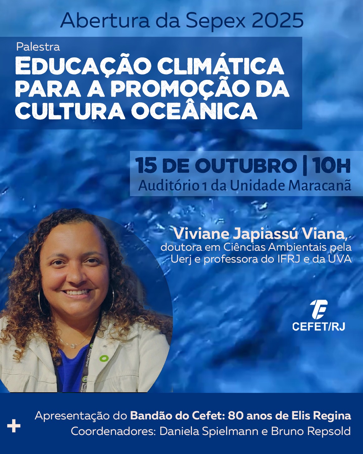 Na quarta-feira (15), a palestra de abertura da Semana de Ensino, Pesquisa e Extensão (Sepex) do Cefet/RJ abordará o tema “Educação climática para a promoção da cultura oceânica”. O evento será conduzido por Viviane Japiassú Viana, doutora em Ciências Ambientais pela Universidade do Estado do Rio de Janeiro (Uerj). A palestra vai acontecer no Auditório 1 da Unidade Maracanã, a partir das 10h.